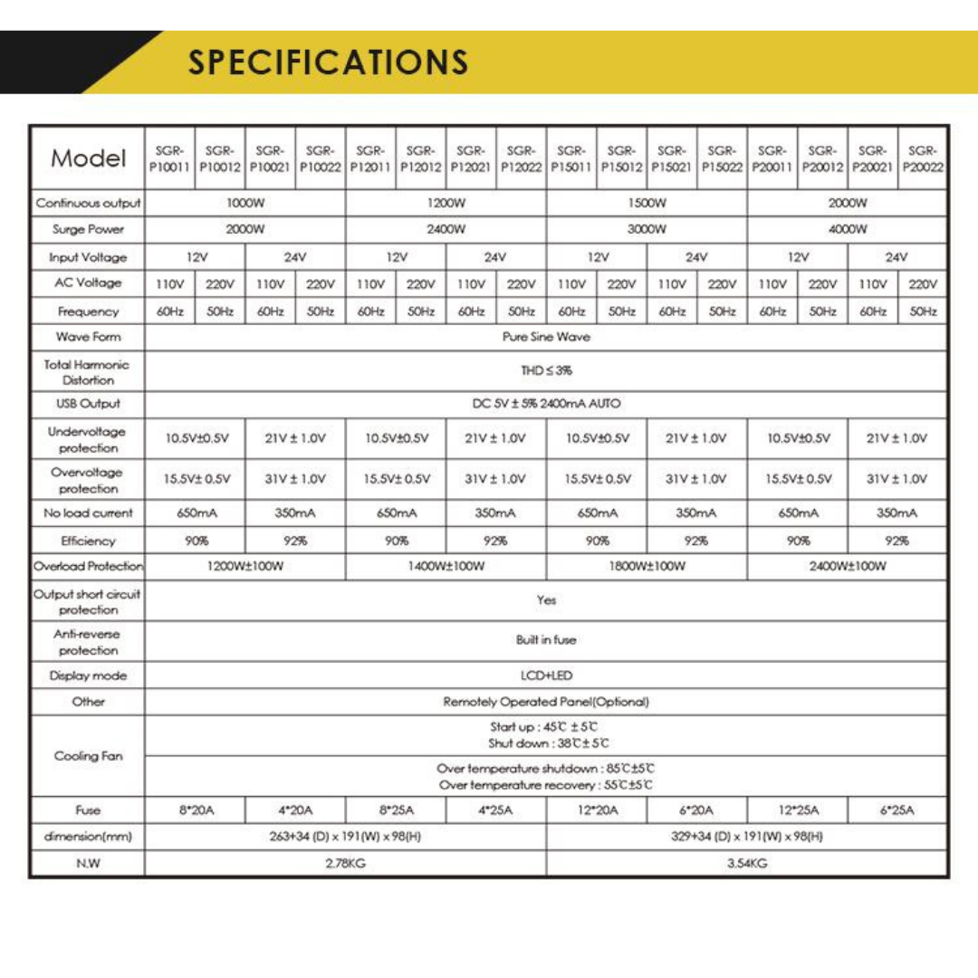• 1500W continuous power, converting 12VDC to 120VAC Pure Sine Wave, and 2000W Peak power.