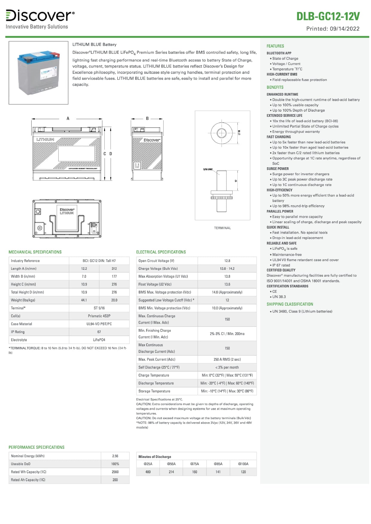 Discover®LITHIUM BLUE LiFePO4 Premium Series batteries offer BMS controlled safety, long life, lightning fast charging performance and real-time Bluetooth access to battery State of Charge, voltage, current, temperature status. LITHIUM BLUE batteries reflect Discover’s Design for Excellence philosophy, incorporating suitcase style carrying handles, terminal protection and field serviceable fuses. LITHIUM BLUE batteries are safe, easily to install and parallel for more capacity.