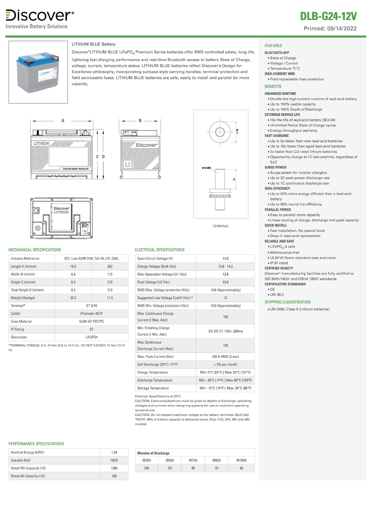 Discover®LITHIUM BLUE LiFePO4 Premium Series batteries offer BMS controlled safety, long life, lightning fast charging performance and real-time Bluetooth access to battery State of Charge, voltage, current, temperature status. LITHIUM BLUE batteries reflect Discover’s Design for Excellence philosophy, incorporating suitcase style carrying handles, terminal protection and field serviceable fuses. LITHIUM BLUE batteries are safe, easily to install and parallel for more capacity.