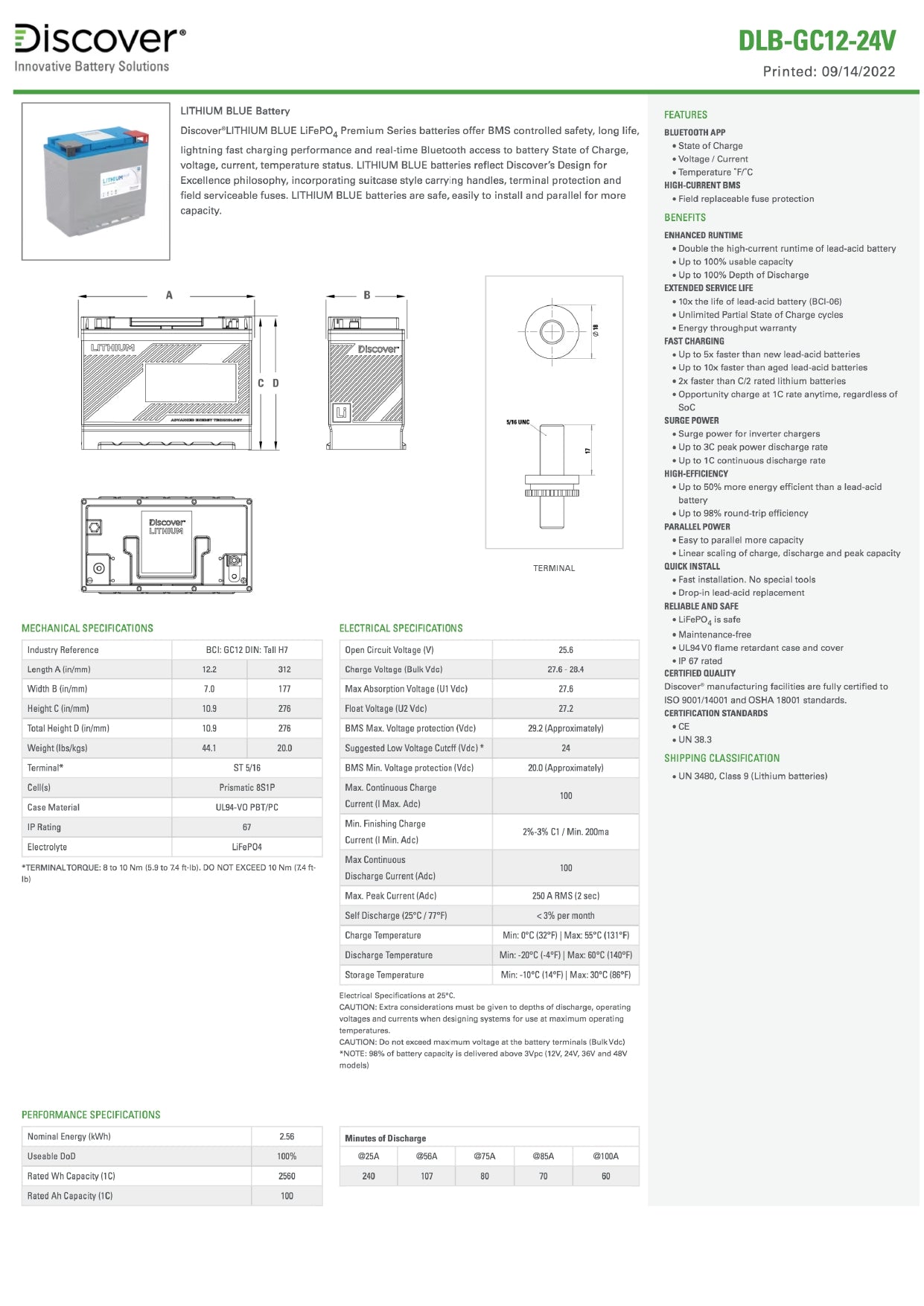 Discover®LITHIUM BLUE LiFePO4 Premium Series batteries offer BMS controlled safety, long life, lightning fast charging performance and real-time Bluetooth access to battery State of Charge, voltage, current, temperature status. LITHIUM BLUE batteries reflect Discover’s Design for Excellence philosophy, incorporating suitcase style carrying handles, terminal protection and field serviceable fuses. LITHIUM BLUE batteries are safe, easily to install and parallel for more capacity.